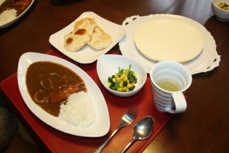シーフードカレー・ナン・ほうれん草とコーンのサラダ・ヨーグルトレアチーズケーキ